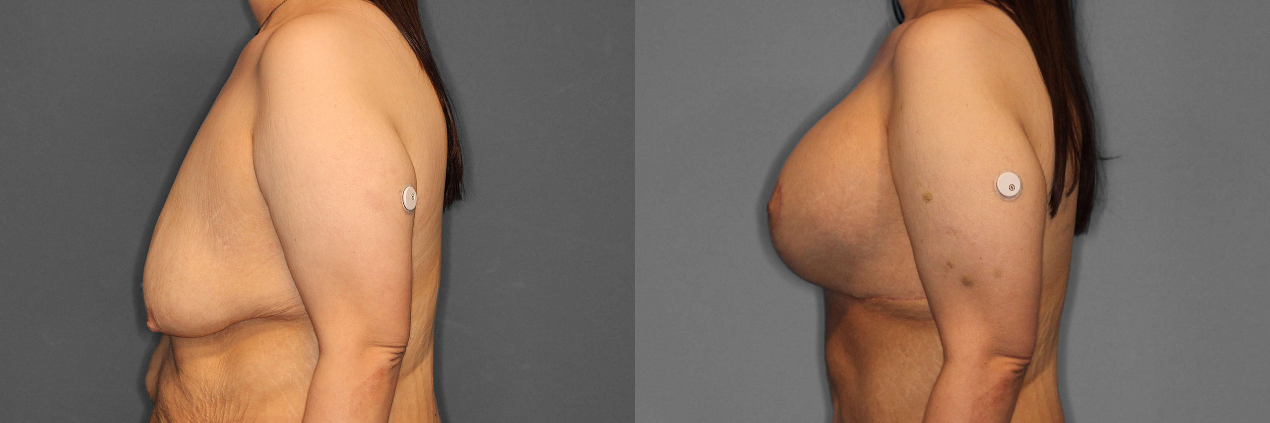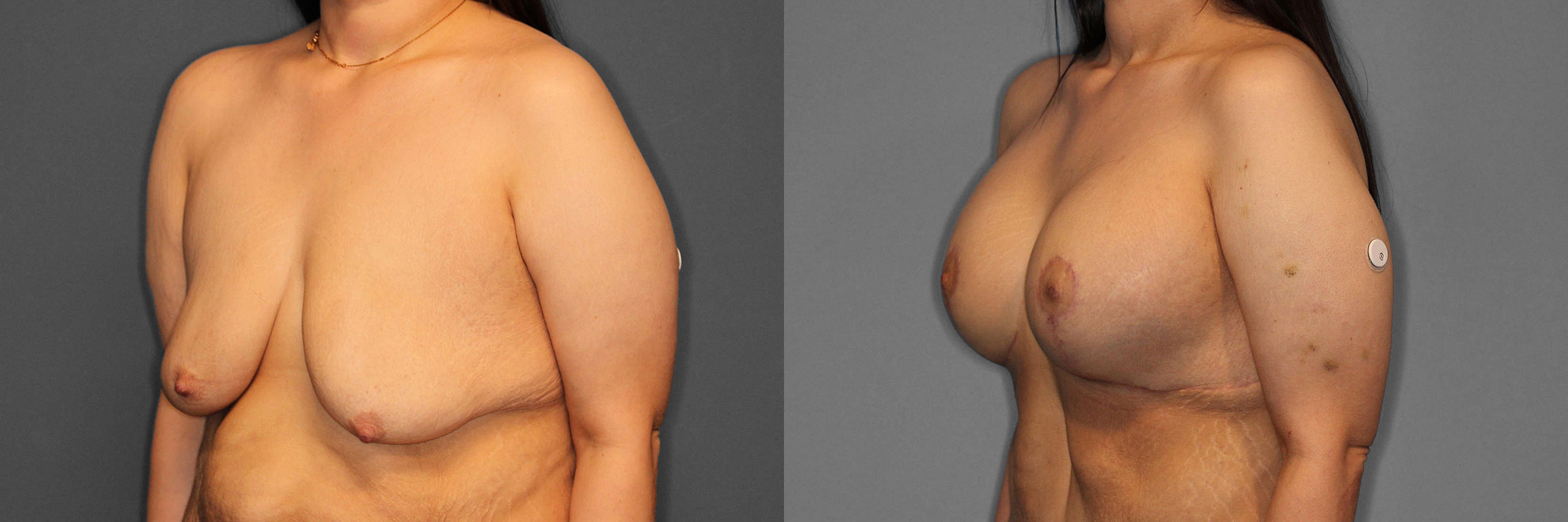 A esta paciente se le realizó Abdominoplastia extendida y Aumento/Levantamiento de Senos. Postoperatorio: 4 meses.